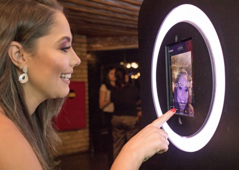Além disso, você pode escolher entre vários adereços virtuais, filtros, realizar a impressão na hora e compartilhar em suas redes sociais. Demais, né?